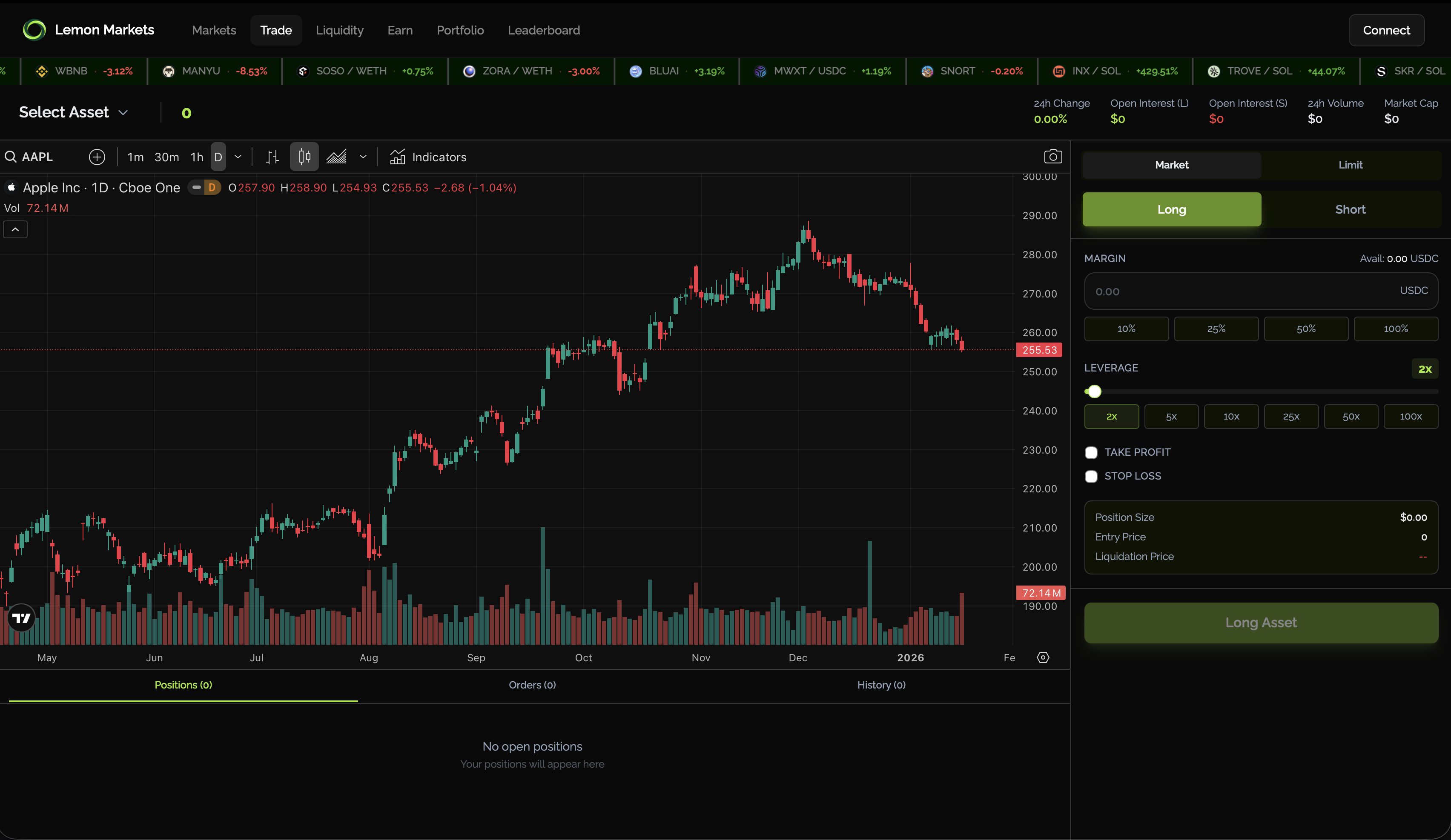 View DocumentationLemon Markets is a decentralized perpetual trading protocol. Trade crypto, forex, and commodities with up to 100x leverage, all onchain with transparent settlement.